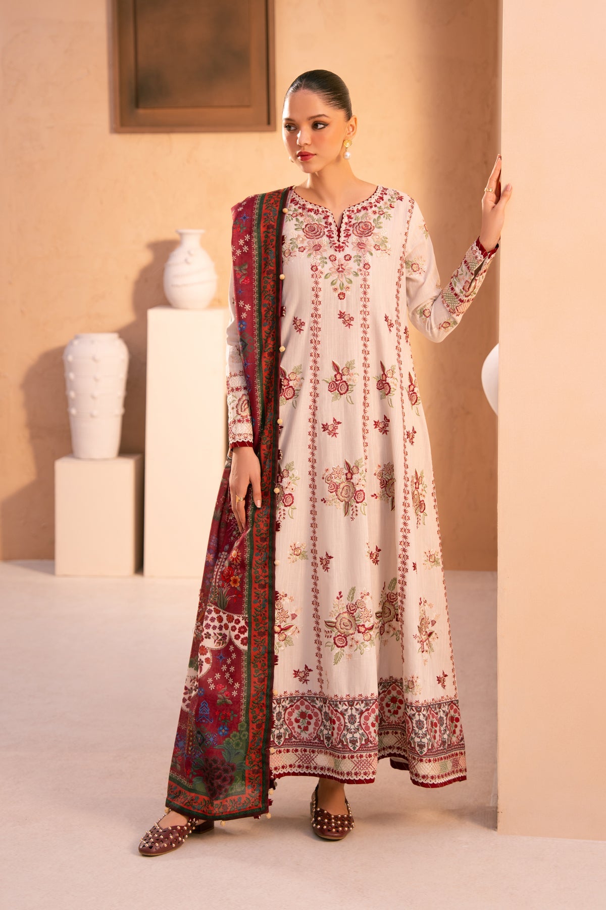 The Iznik Sahla Slub Khaddar is a masterpiece designed to make you feel like a queen on your special day. Crafted with exquisite attention to detail, this ensemble is a perfect blend of elegance, comfort, and style.