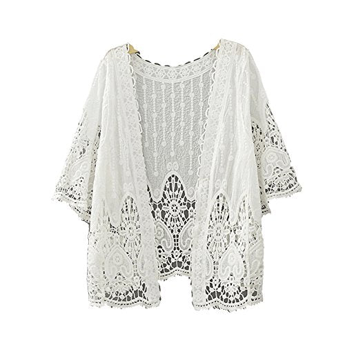 Women's Floral Lace Crochet Front Open Cover Ups Half Sleeve Kimono Cardigan