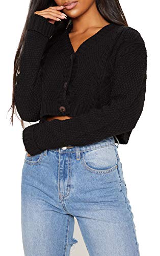 Women's Ladies Long Sleeve 3 Button Cropped Chunky Aran Cable Knitted Grandad Cardigan