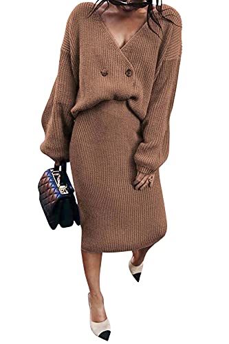 Gemijacka Women's Dresses Deep V Neck Two-Pieces Knit Dress Long Sleeve Double-Breasted Cardigan with Midi Pencil Skirt