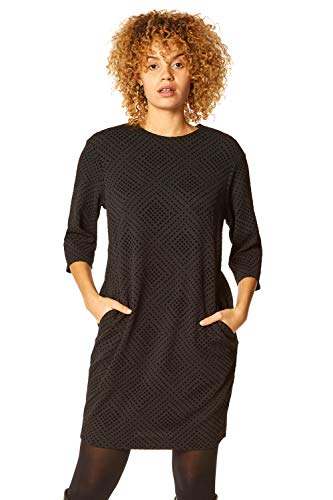 Women Diamond Flock Pocket Dress - Ladies Daywear Everyday Smart Casual Workwear Patterned Round Neckline 3/4 Length Sleeve Knee Length Tea Dress