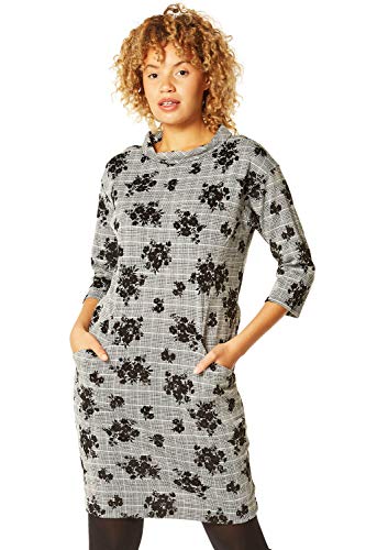 Women Floral Flocked Roll Neck Dress - Ladies Autumn Winter 3/4 Sleeve Round High Neckline Velvet Check Printed Smart Casual Work Evening Dresses