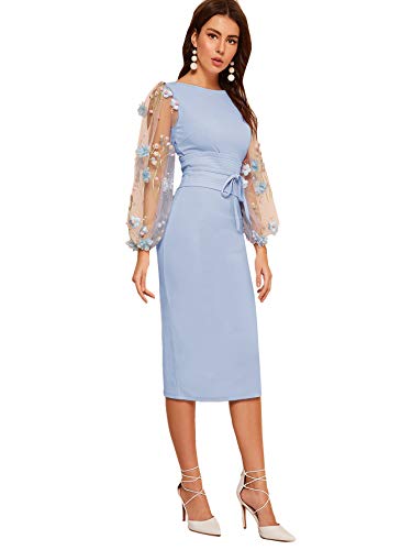 SheIn Women's Elegant Mesh Contrast Bishop Sleeve Tie Front Bodycon Pencil Dress