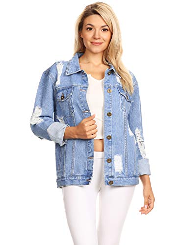 Anna-Kaci Women Long Sleeve Oversize Denim Jacket Ripped Distressed Boyfriend Jean Coat