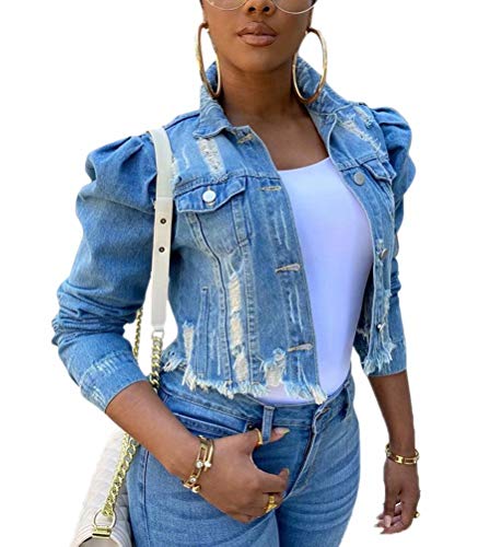 Women Denim Distressed Jacket Puff Sleeve Ripped Pockets Vintage Washed Classic Button Up Cropped Destroyed Jean Coat