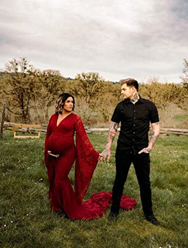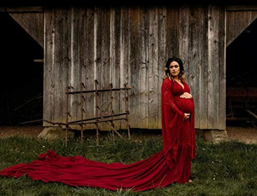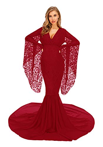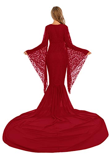 Deep V Neck Lace Gown For Photography Photo Shoot Flared Sleeve With Long Chiffon Train