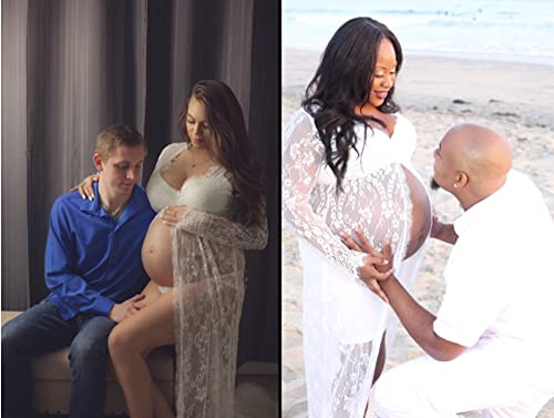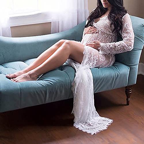 Women Photography Lace Dress, White See-through Maxi Dress With Long Sleeve V-neck Split Front Lace