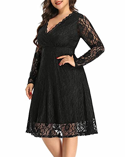 Women Plus Size Floral Lace V Neck Long Sleeve Knee Length Wedding Guest Cocktail Dress