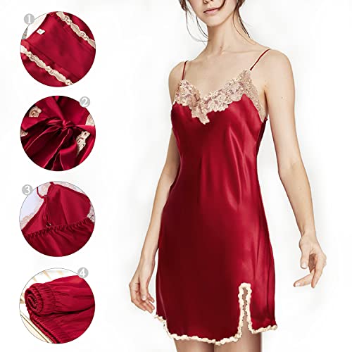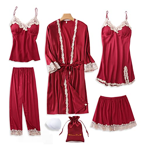 Women Sleepwear 6pcs Satin Pajama Set With Chest Pad Lace Trim Sexy Lingerie Nightgown Robe Soft Silk Dress Nightwear