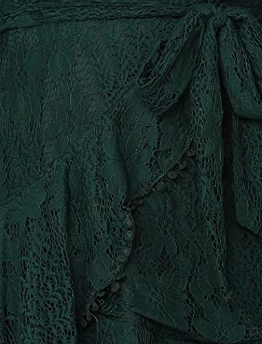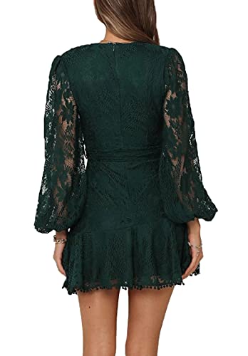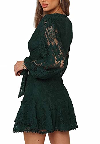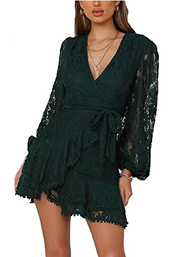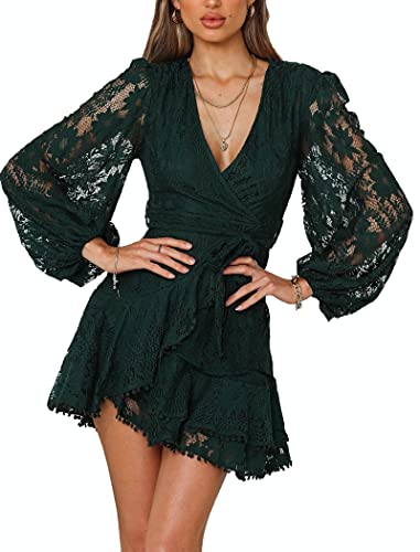 Women's Floral Flower Lace Faux Wrap Mini Dresses V Neck Long Lantern Sleeve Short Dress With Waist Ties