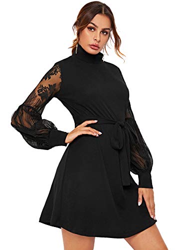 Women's Mesh Bishop Sleeve Mock Neck Solid Tunic Short Dress