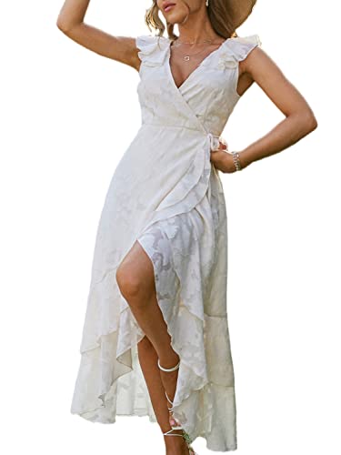 Women's Summer Sleeveless V Neck Ruffle Midi Dress Side Split Casual One Piece Wrap Long Dresses With Belt