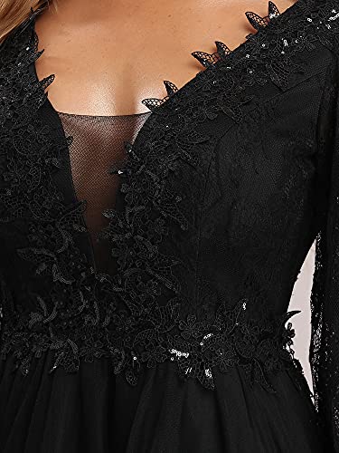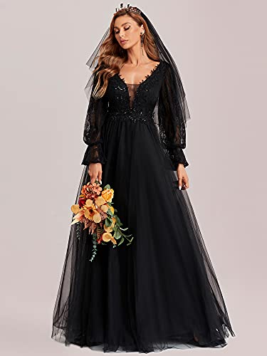 Women's V Neck Maxi Long Sleeves See-through Sexy Lace Black Wedding Dress For Bride 90336