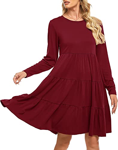 Women's Casual Long Sleeve Dresses Wedding Guest Loose Fit Solid Cotton Ruffle Babydoll Dress