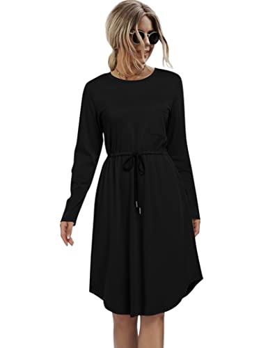 KoJooin Women Crew Neck Long Sleeve T-Shirt Dress Casual Pullover Adjustable Drawstring Midi Dress with Pockets