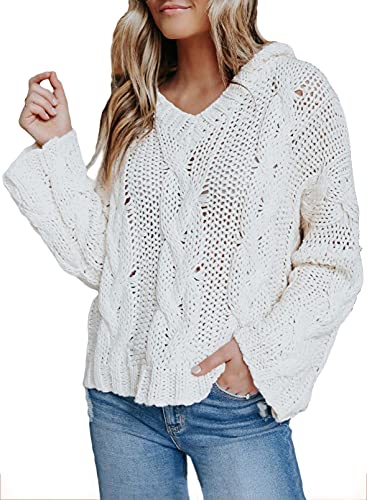 Dokotoo Womens Casual V Neck Long Sleeve Cable Knit Hooded Pullover Sweaters