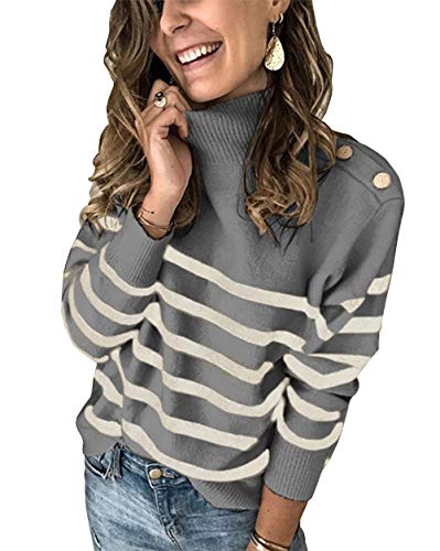 KIRUNDO 2021 Winter Women’s Long Sleeves Knit Sweater Turtleneck Striped Print Loose Pullover Tops Deco with Metal…