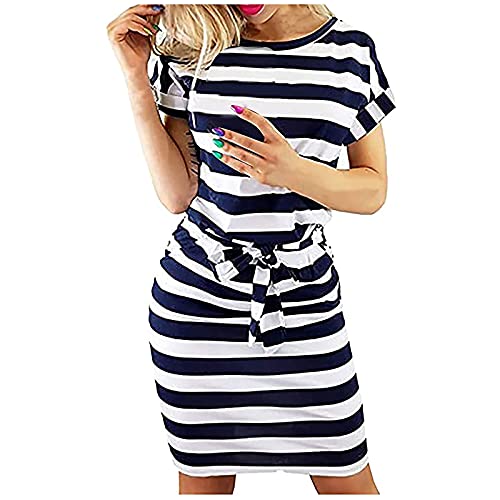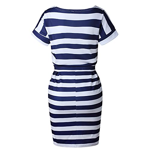 Ladies Striped Short Sleeve Wear to Work Casual Pencil Dress with Belt UK Size Party Dress