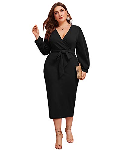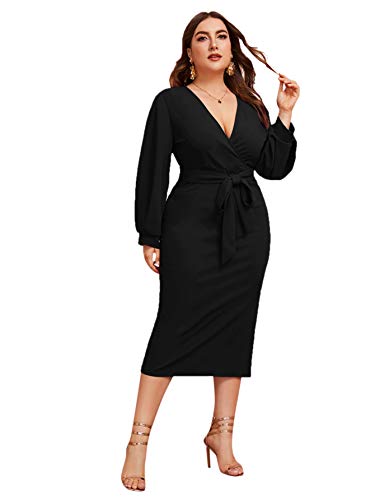 Women's Plus Size Bishop Sleeve Plunging V Neck Belted Bodycon Dress