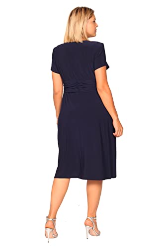 Tie closure This charming short-sleeved silhouette is an excellent addition to shaking up your wardrobe. Much like the sunrise, this faux wrap-lined dress will leave you casting the world in shimmering hues of brightness. The best part? This dress is perfect for its timeless elegance and easy fit. This dress is the perfect pick-me-up for your formal wear collection. It's got a light and airy design that can be worn to any event, making it a timeless classic! The fitted surplice neckline inset will make you feel like royalty. Check out the dress' soft spandex fabric, which guarantees comfort no matter how long one is at a venue! This stunning piece has everything: classiness, simplicity and total elegance.