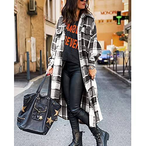 Ainangua Women's Casual Wool Blend Long Plaid Shirt Jacket Button Down Pocketed Shirt Shacket (Gray, XS)