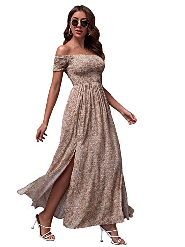 Apricot Women's Boho Floral Print Off Shoulder Split Long A Line Dress - Floerns