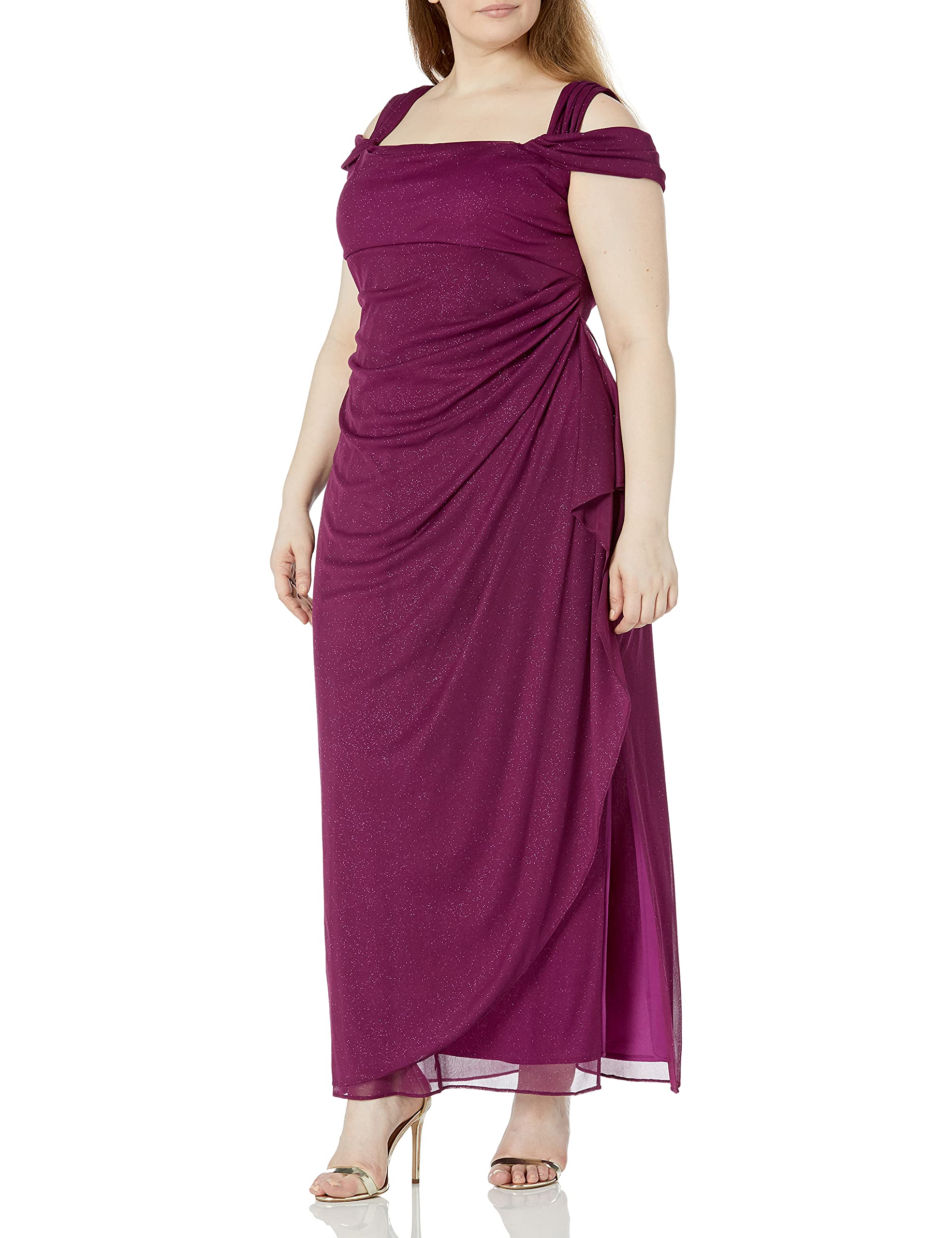 Berry Women's Plus Size Long Cold Shoulder Dress with Ruched Skirt - Alex Evenings