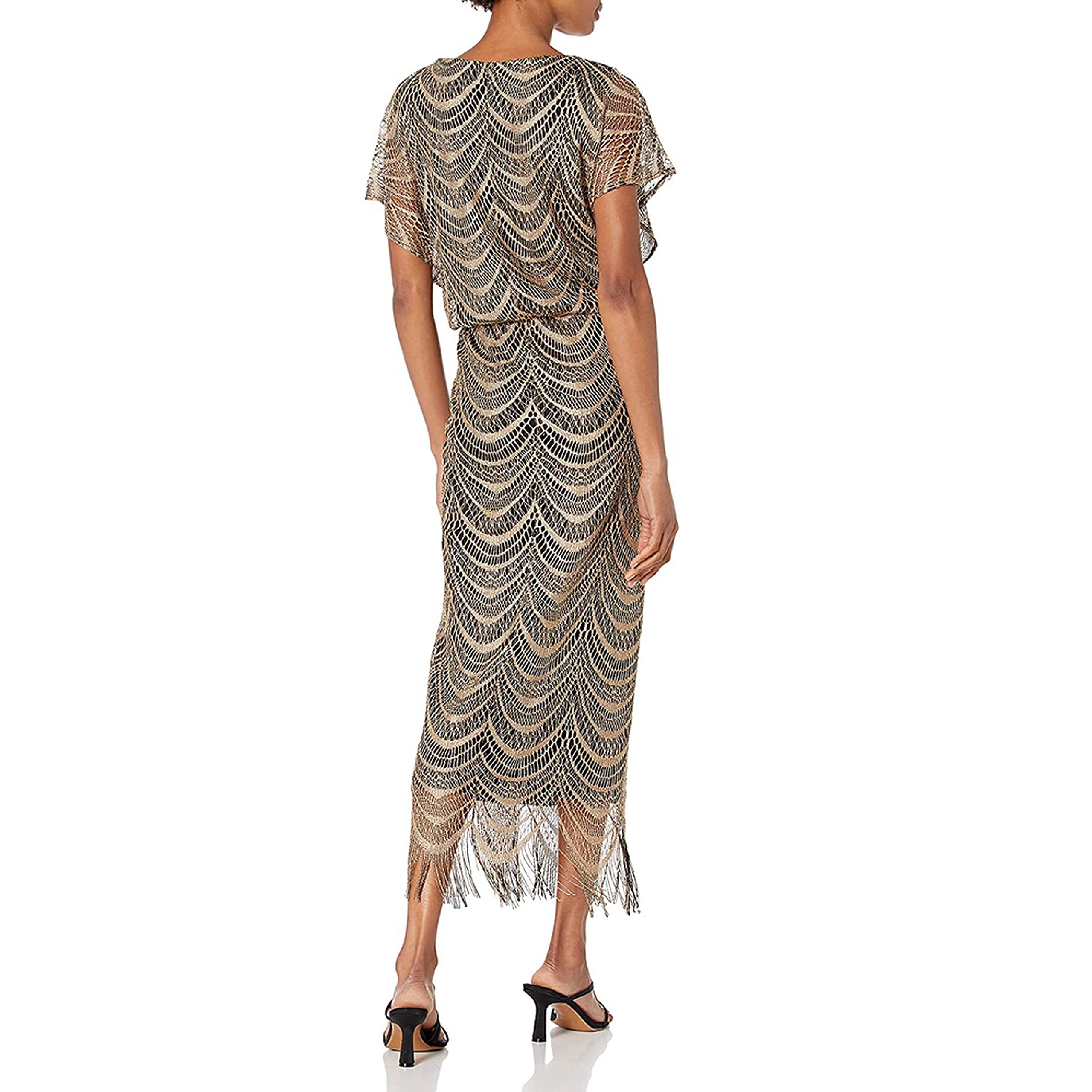 Black and Gold Plus Women's Blouson Metallic Crochet Dress with Fringe Hemline - S.L. Fashions