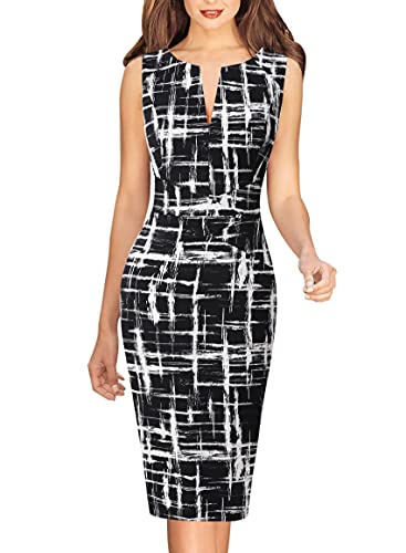 Black And White Geometric Print Womens Front Zipper Slim Work Office Business Cocktail Party Pencil Dress Vfshow