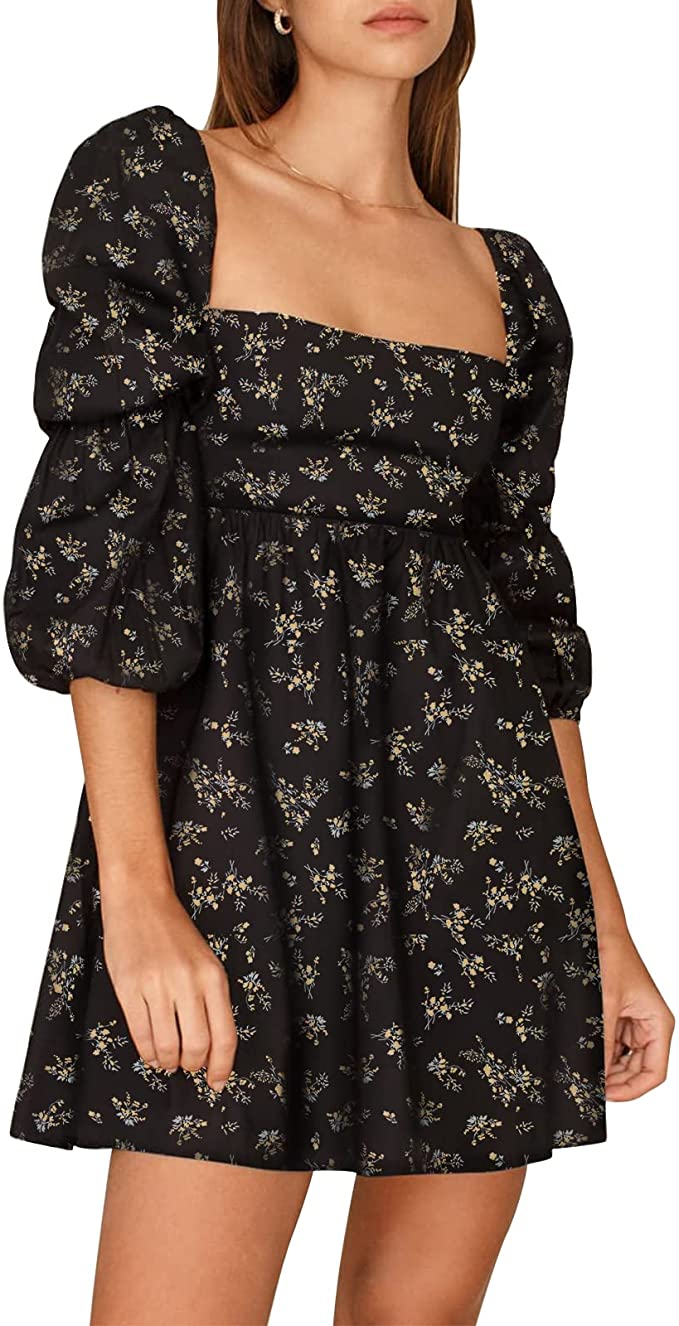 Black Floral Womens Square Neck Dress Long Puff Sleeve A-Line Casual Short Mini Dress - Exlura
