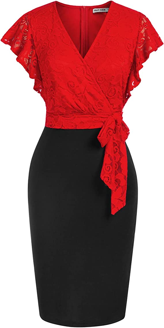 Black Lace Women Formal Surplice Pleated V-Neck Belted Dresses Business Work Bodycon Dress - GRACE KARIN