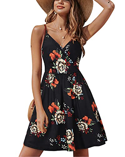 Black Orange Floral V Neck Floral Spaghetti Strap Summer Dress Casual Swing Midi Sundress with Pocket - STYLEWORD