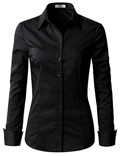 Black Sleeve Womens Slim-Fit Long Sleeve Stretchy Button Down Collar Office Formal Casual Shirt Blouse - EZEN