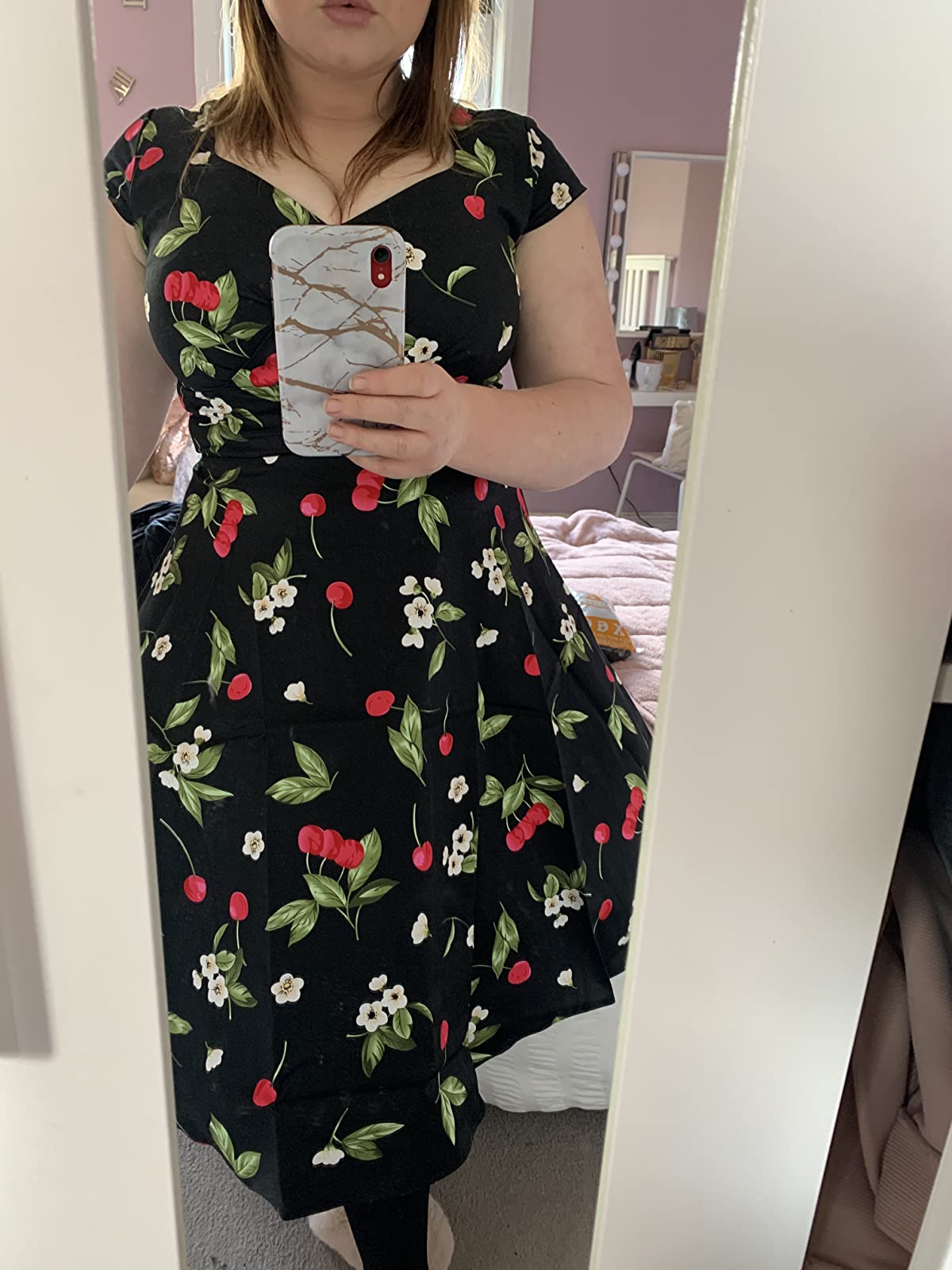 - Fabric: 98% cotton, 2% spandex .Feature: A-line,Cap-sleeves,Knee-length,Back zipper closed,Ruching Bodice,Full circle flared skirt, Classic Audrey Hepburn dresses.