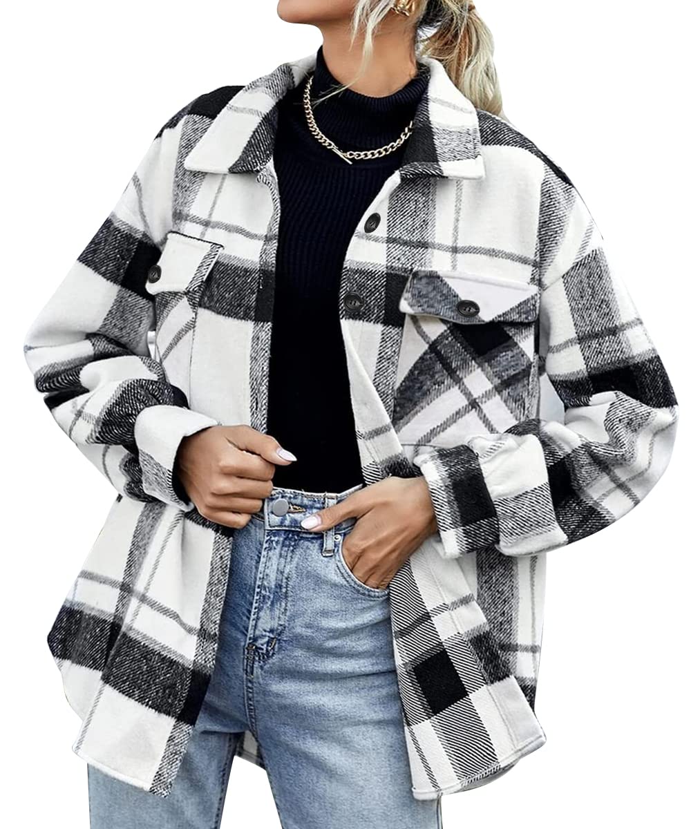 Black White Womens Casual Plaid Shacket Wool Blend Button Down Long Sleeve Shirt Fall Jacket Shackets - AUTOMET