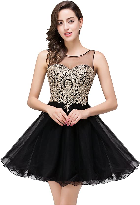 • 2021 Junior's Homecoming Dresses Rhinestones Gold Applique Short Prom Dresses