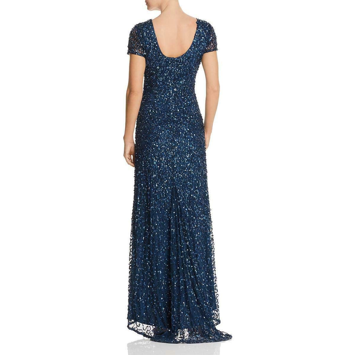 - This gorgeous sequin gown is filled with fabulous features, including short sleeves, a long, flowing soft skirt, a crew neck and a scoop back with a subtle back zipper closure