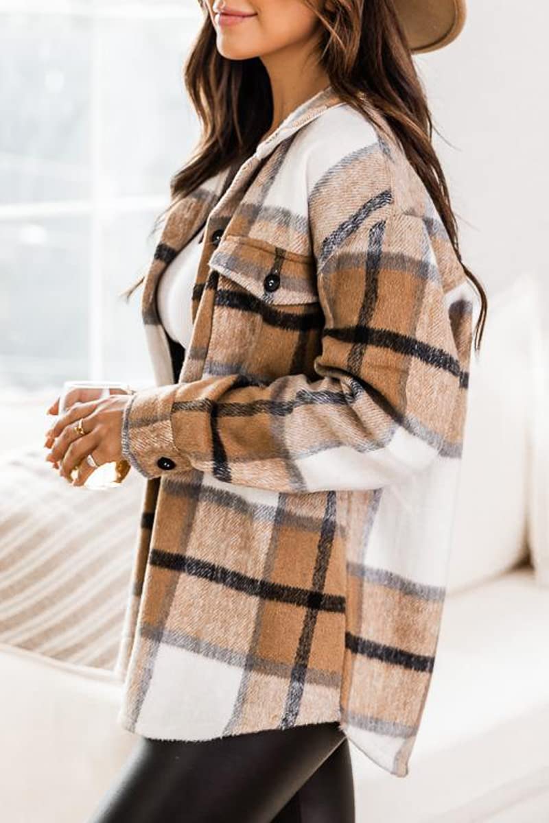 Blue Brown Womens Casual Plaid Shacket Wool Blend Button Down Long Sleeve Shirt Fall Jacket Shackets - AUTOMET
