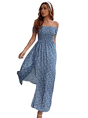 Blue Floral Multi Women's Boho Floral Print Off Shoulder Split Long A Line Dress - Floerns