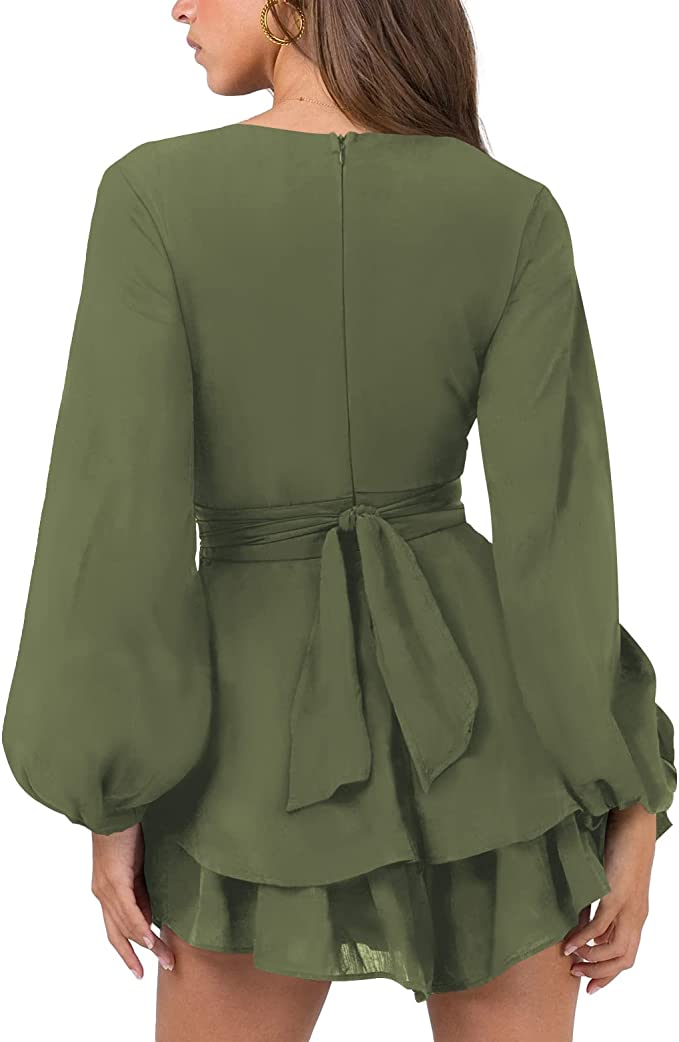 - Fashion Design Elegant/formal/ nude/basic/short/mini/skater/prom/swing dress, with sexy deep v neck,empire waist with tie,long baggy/puff sleeve, wrap front, back zipper, tiered ruffle hem, The waist tie allows for you to tie as tight or loose as you prefer, then it will fits your curve perfectly. Easy to care on daily life or travel. Perect gift for holiday, vocation, party, dinner, date night.