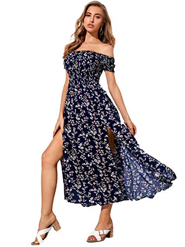 Blue Women's Boho Floral Print Off Shoulder Split Long A Line Dress - Floerns