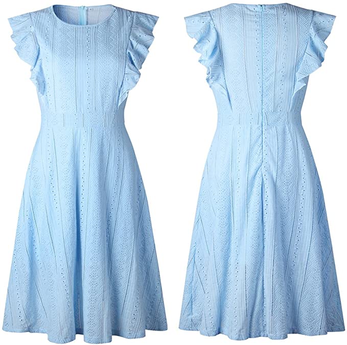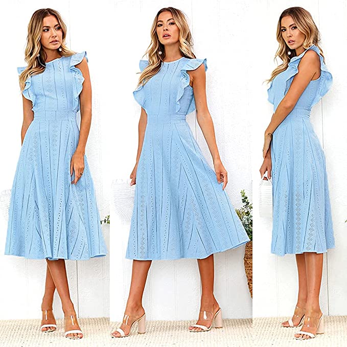 Blue Womens Dresses Elegant Ruffles Cap Sleeves Summer A-Line Midi Dress - ECOWISH