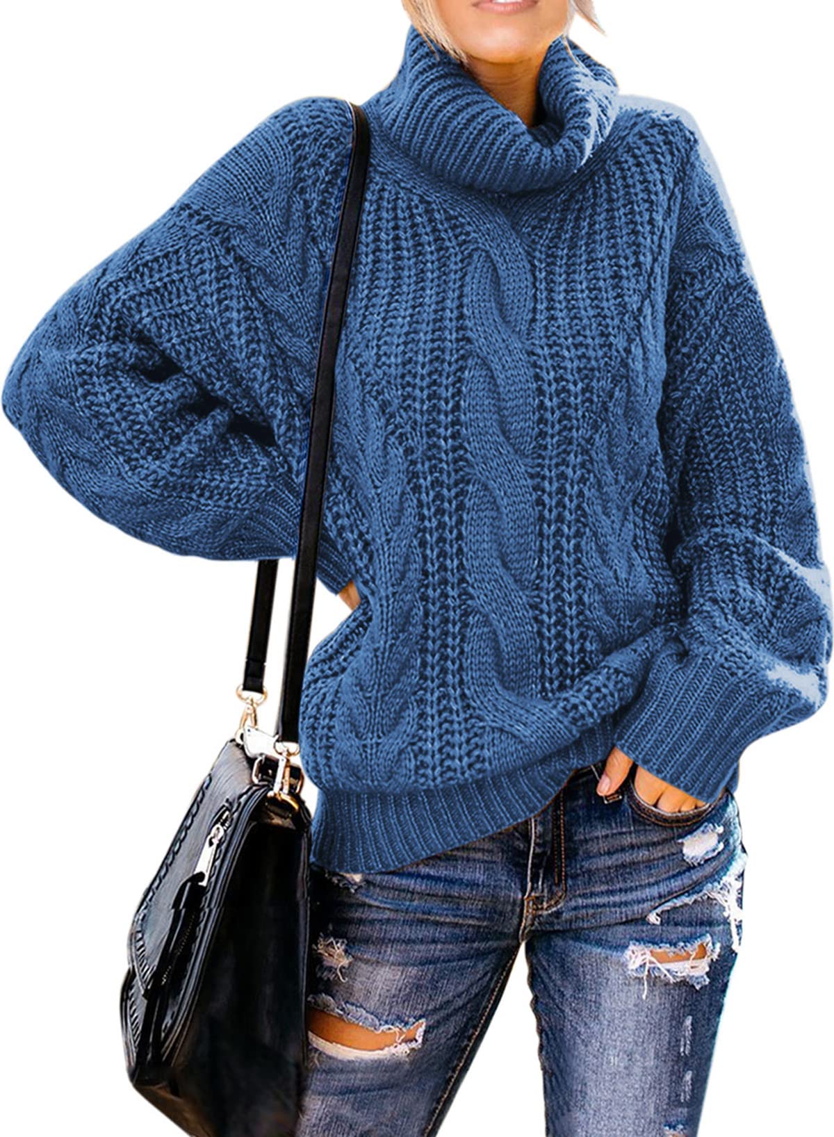Blue Women's Turtleneck Balloon Long Sleeve Casual Loose Chunky Cable – Original Brand
