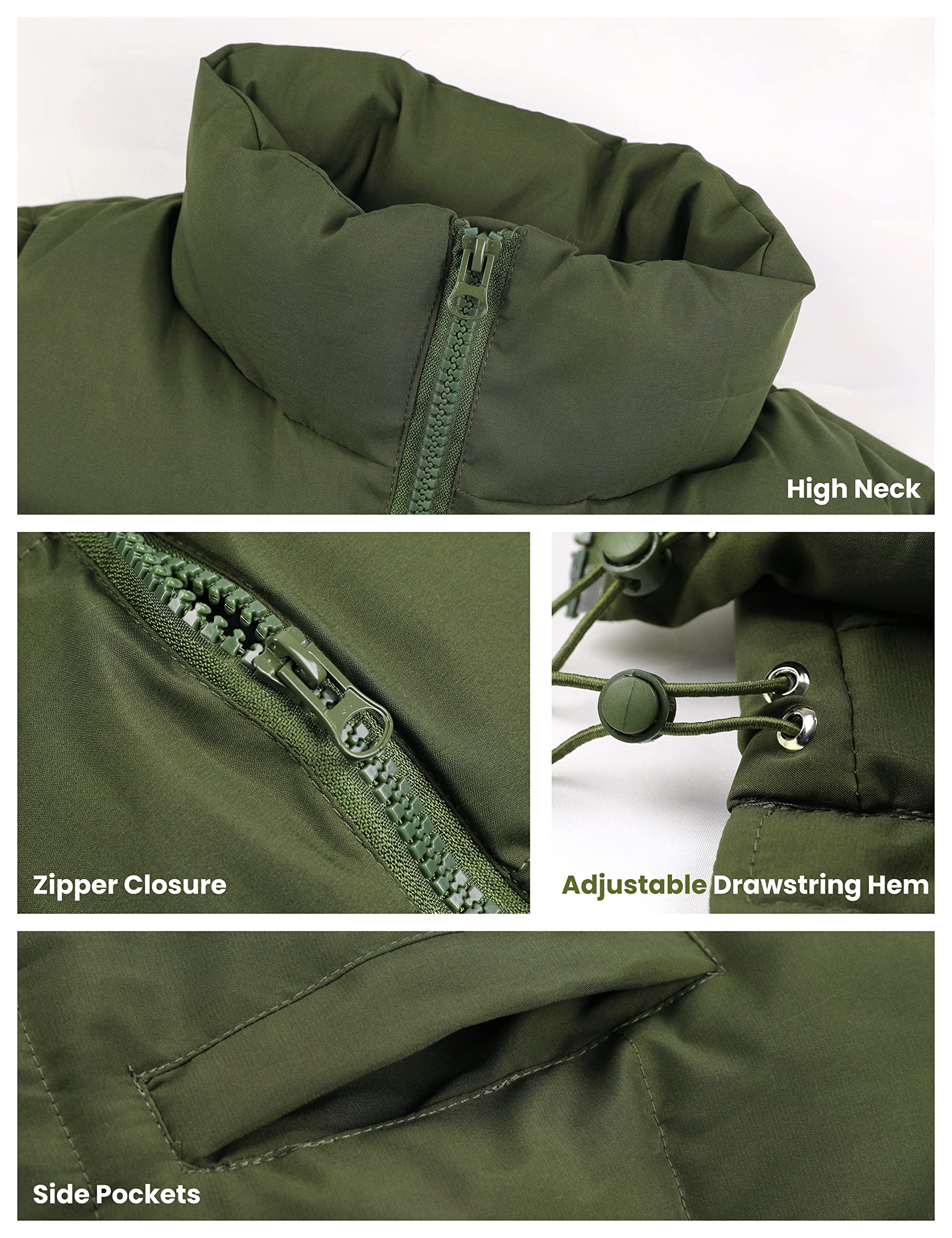 - High collar, adjustable drawstring hem, front zipper closure, solid color, cute and stylish winter puffer vest for women