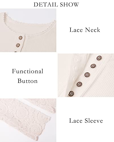 BTFBM Women Long Sleeve V Neck Button Up Solid Tops Blouses Trendy Slim Fit Lace Sleeves Ribbed Knit Casual Shirts Tunic (Lace White, Medium)