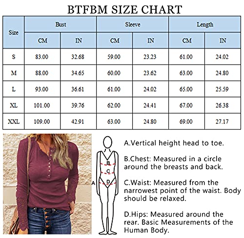 BTFBM Women Long Sleeve V Neck Button Up Solid Tops Blouses Trendy Slim Fit Lace Sleeves Ribbed Knit Casual Shirts Tunic (Lace Wine Red, Medium)