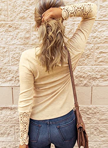 BTFBM Women Long Sleeve V Neck Button Up Solid Tops Blouses Trendy Slim Fit Lace Sleeves Ribbed Knit Casual Shirts Tunic (Lace Yellow Apricot, Medium)