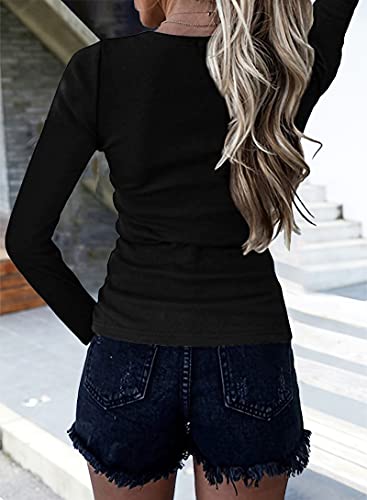 BTFBM Women Long Sleeve V Neck Button Up Solid Tops Blouses Trendy Slim Fit Lace Sleeves Ribbed Knit Casual Shirts Tunic (Solid Black, Medium)