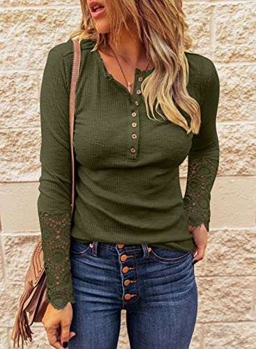 BTFBM Women Long Sleeve V Neck Button Up Solid Tops Blouses Trendy Slim Fit Lace Sleeves Ribbed Knit Casual Shirts Tunic(Lace Amry Green, Medium)