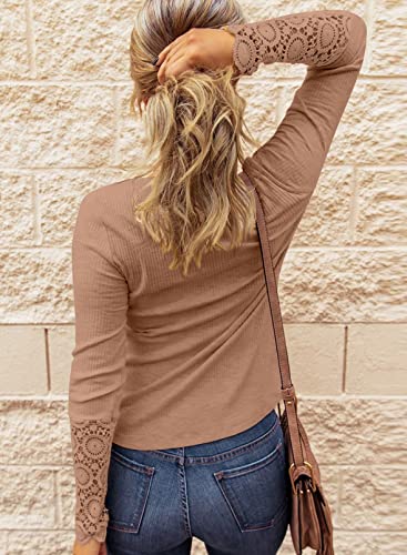 BTFBM Women Long Sleeve V Neck Button Up Solid Tops Blouses Trendy Slim Fit Lace Sleeves Ribbed Knit Casual Shirts Tunic(Lace Camel, Medium)